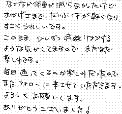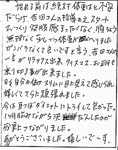 また、栄養補助食品をきちんと摂っていない人(痩身中)は体重が落ちても脂肪が落ちずに、筋肉や骨(活性組織)などが落ちてしまいます。この場合、非常に身体に悪影響を及ぼすため、こちらの注意を聞いていただけない場合は途中であっても中止していただくこともあります。必ず身体のために栄養補助食品を摂って下さい!